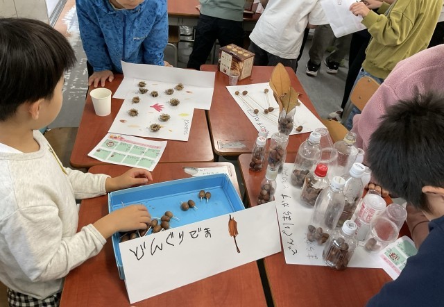 秋見つけで見つけてきた、どんぐりや松ぼっくりなどを使って、作ったおもちゃで、遊びコーナーを用意して、