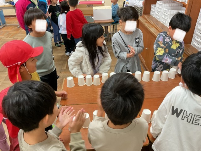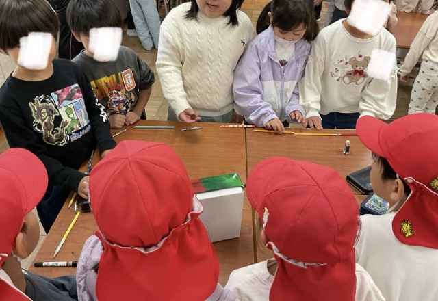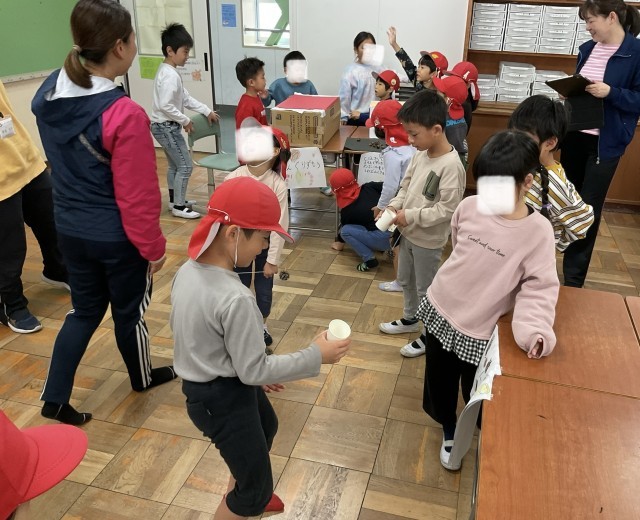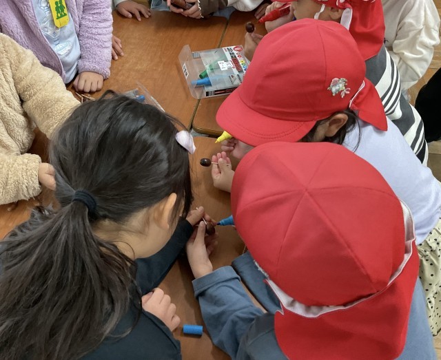 どんぐりや松ぼっくりを使って作ったおもちゃで、遊びコーナーで遊んでもらいました。
