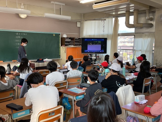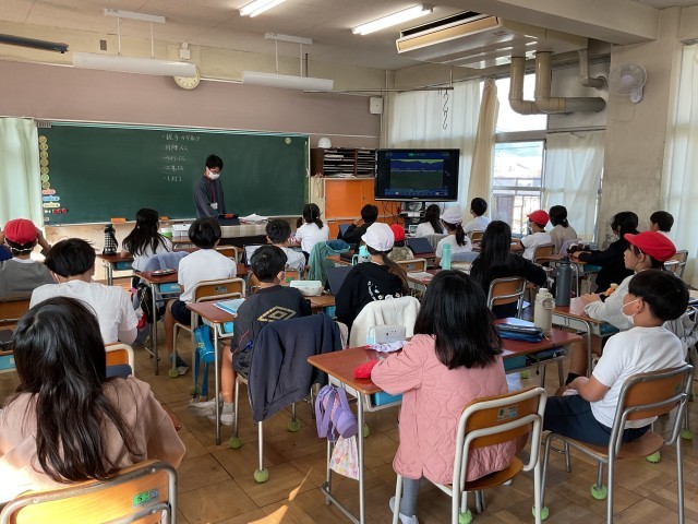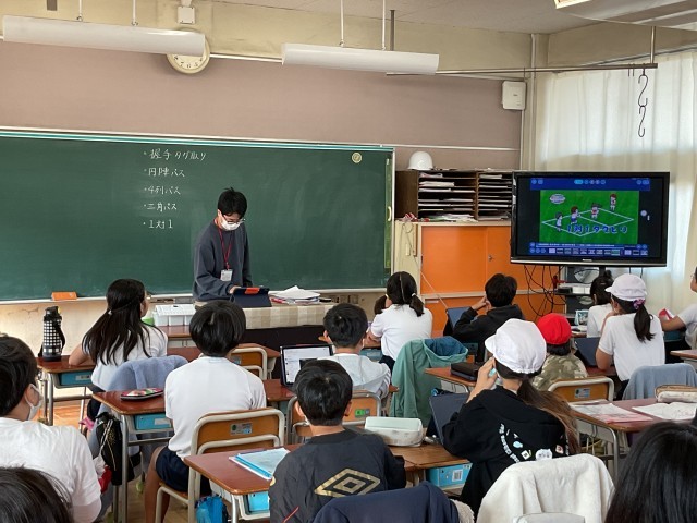 5年生の朝学習の時間では、体育で行うタグラグビーのルールや留意点を説明しています。