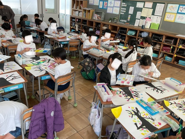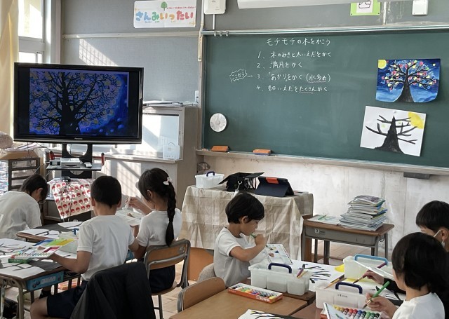 3年生の図工の時間に、国語で習っている「もちもちの木」を描きます。