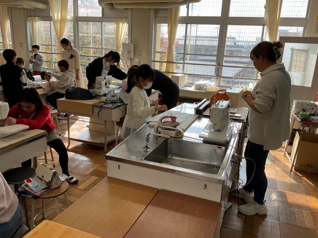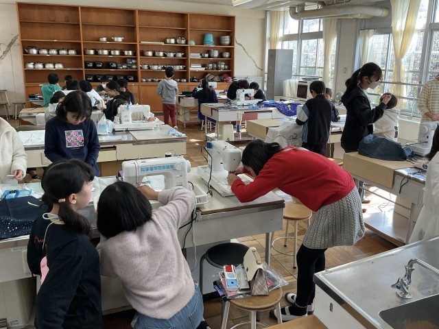 5年生が家庭科室でミシンを使って、エプロンを作っています。