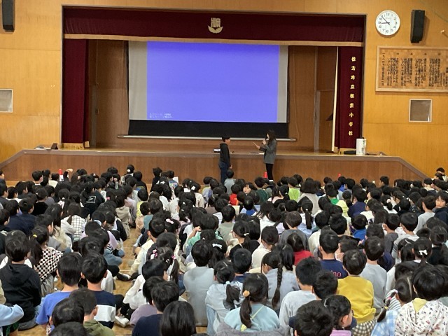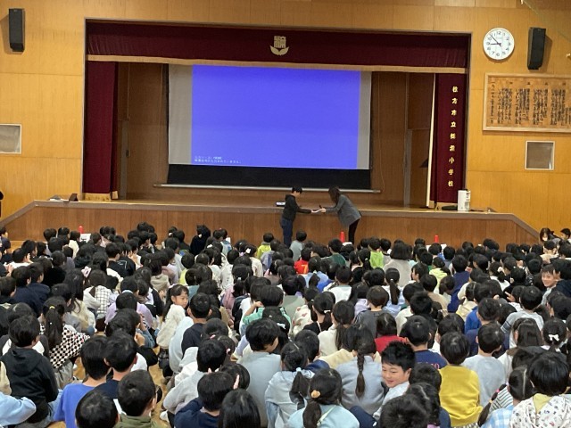 児童朝会で、自主的に色々なことにチャレンジし優秀な成果を残した児童の表彰を行いました。