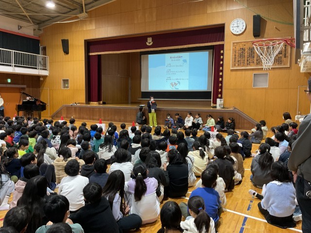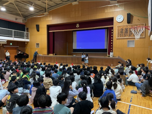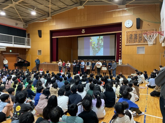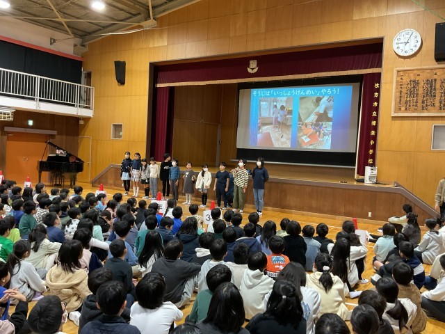 児童朝会では、委員会の活動報告やお願い、お知らせなどを行なっています。