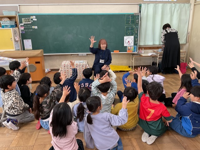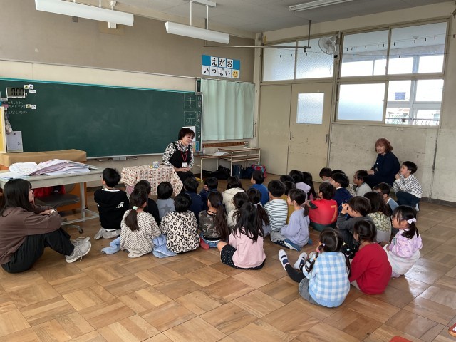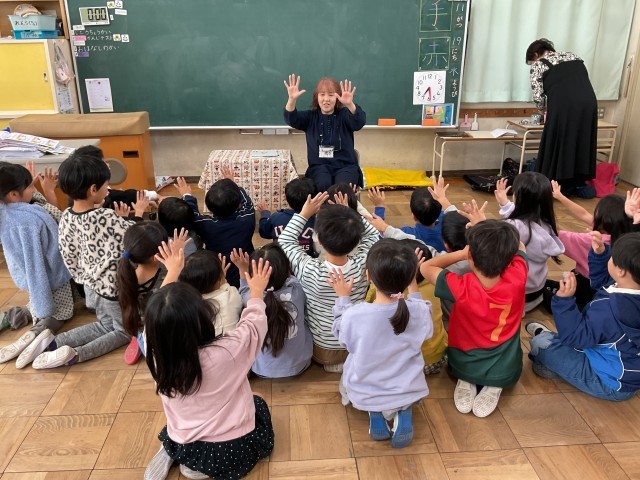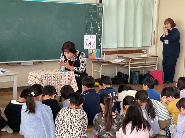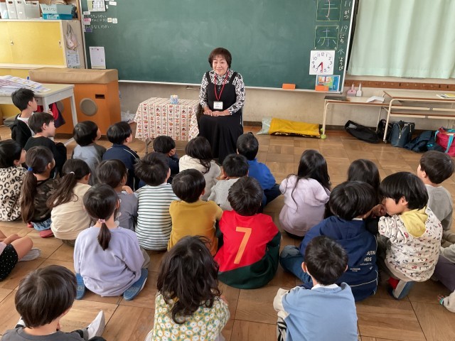 今日は1年生の1クラスに、お話の会の方が来てくれて、ストーリーテリング、手遊び、絵本の読み聞かせなどをしてくれました。
