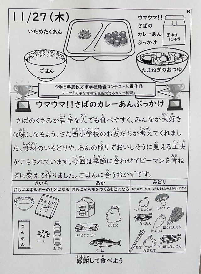 今日は、児童が考えたメニュー「ウマウマ!さばのカレーあんぶっかけ」でした。