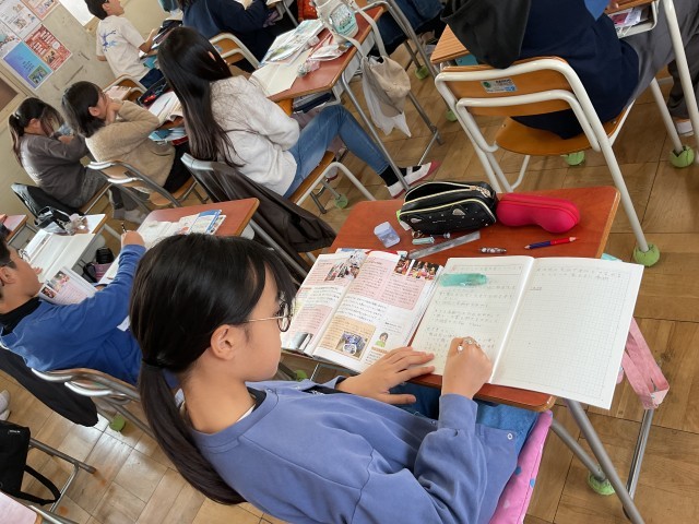 机上に教科書と資料集を広げて、考え、まとめます。