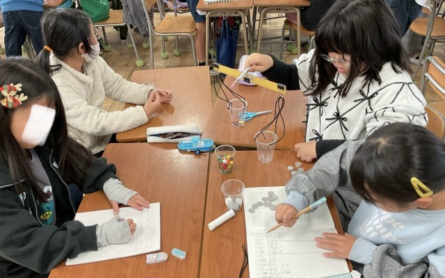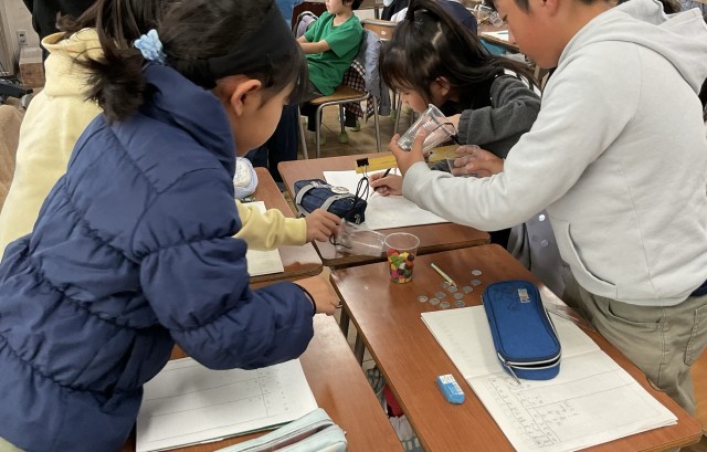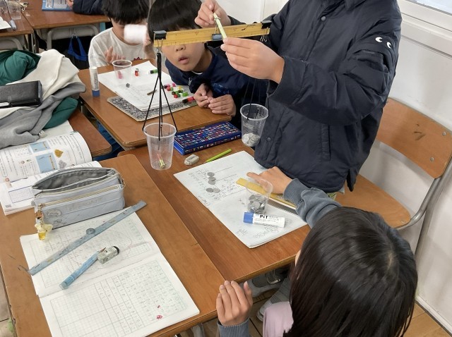 天秤などを使って、直接比較することを実験したあとは、ブロッックや1円玉などの