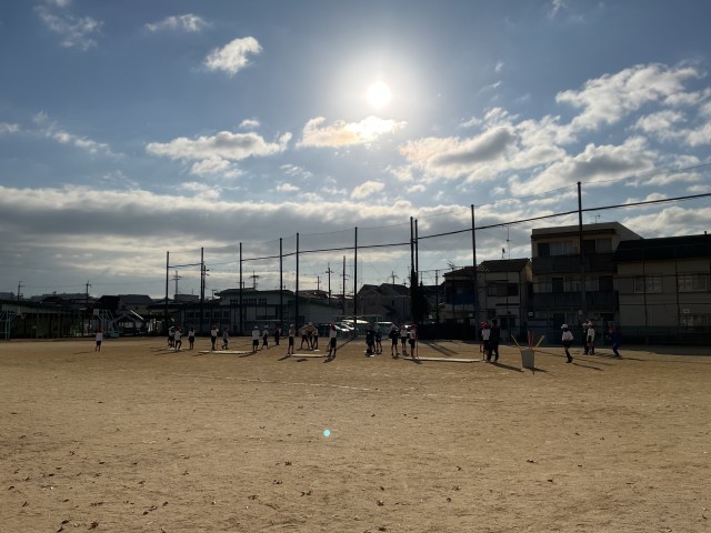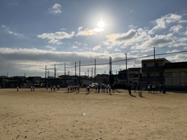4年生が、午前中の日差しの中、運動場で体育をしています。