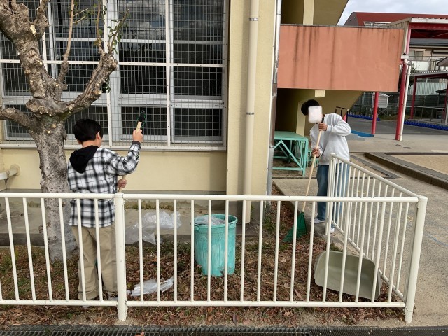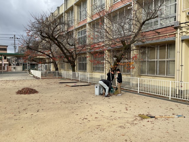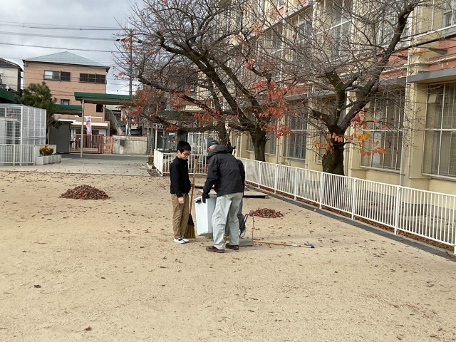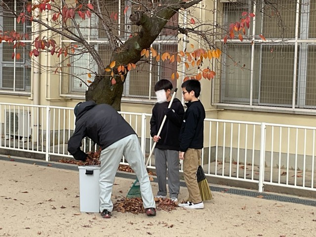 6年生が、運動場の落ち葉をほうきで集めたり、拾ったりしてくれていました。