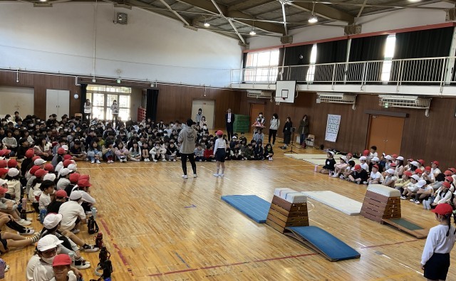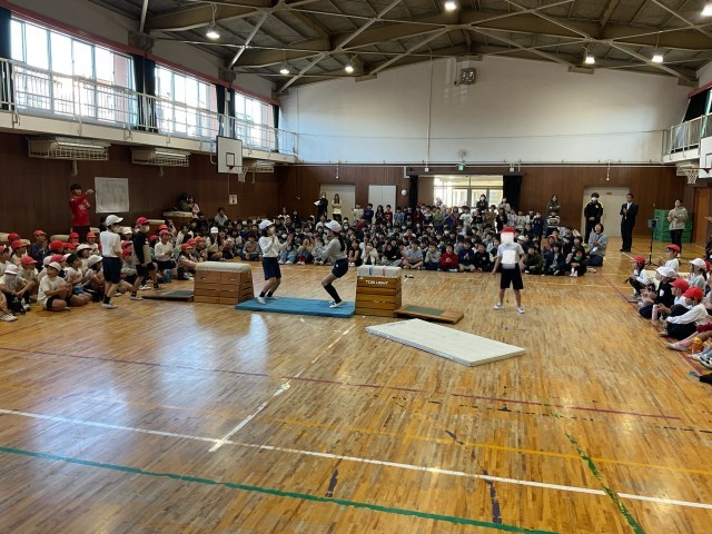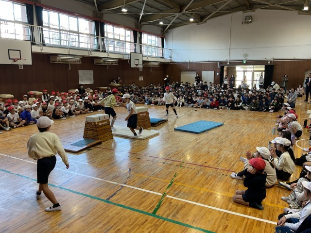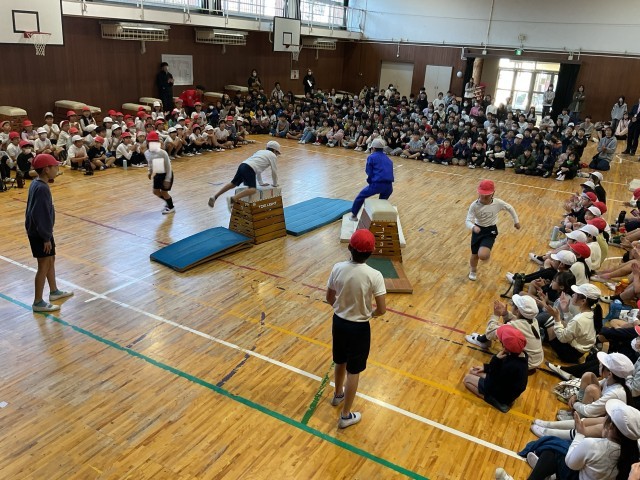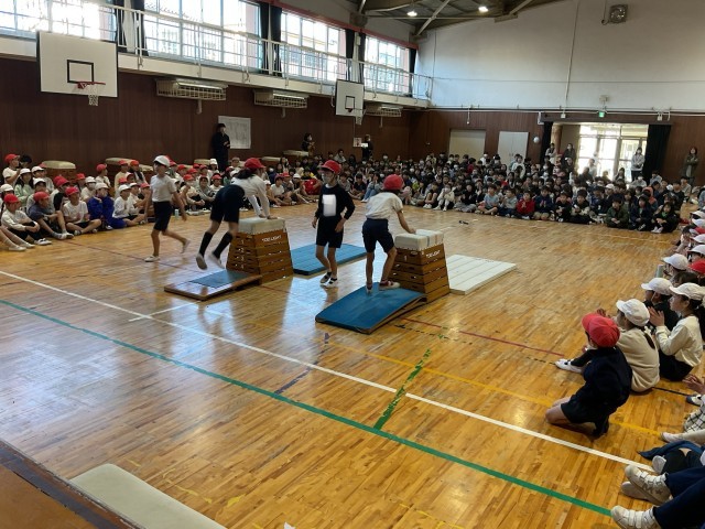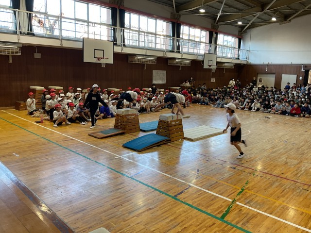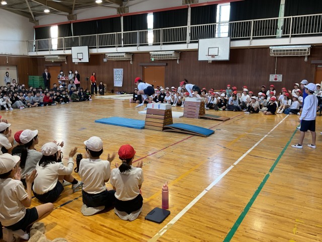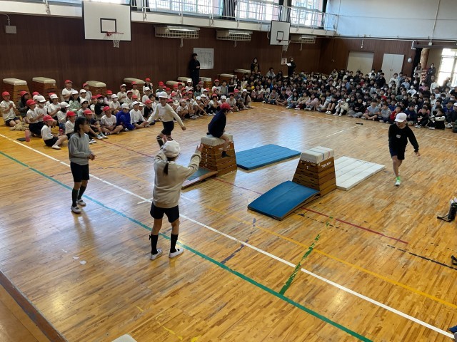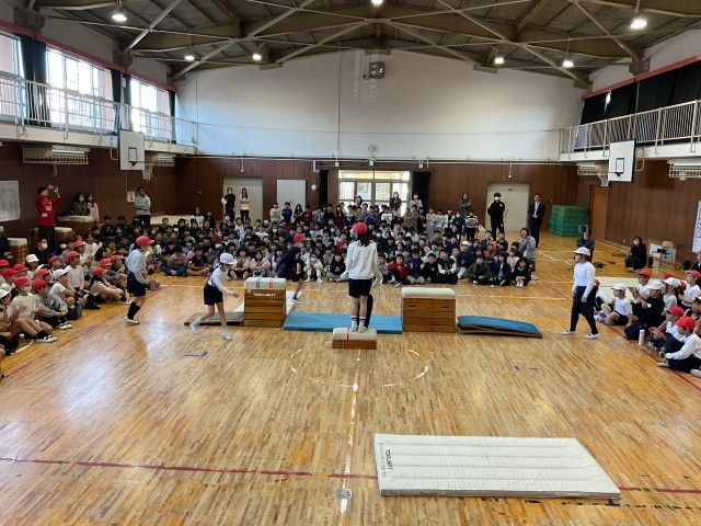 3年生全クラスと、同じくシンクロ跳び箱に取り組んでいる6年生と、2年生が見学にきました。