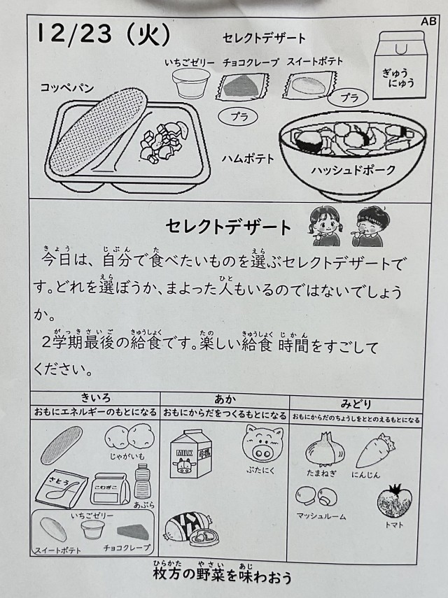 セレクトデザートは、チョコクレープ、いちごゼリー、スウィートポテト、です。