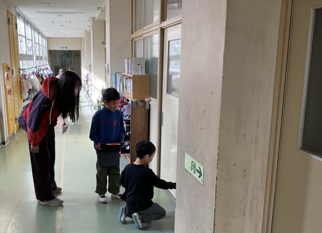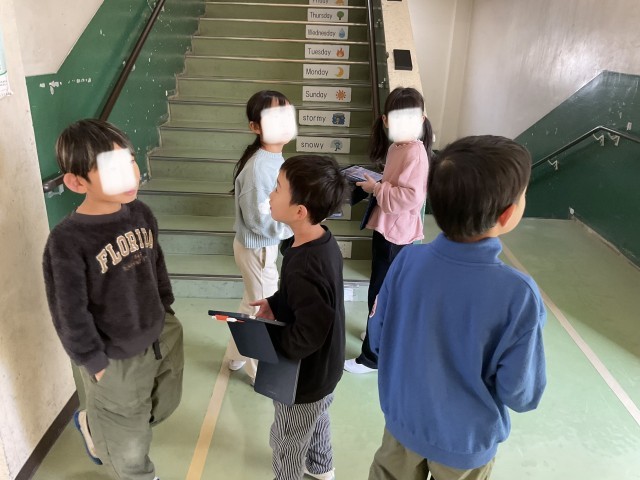 1年生が、学校の中で数字を見つけて、ビンゴを完成させています。