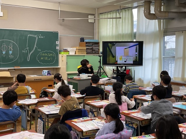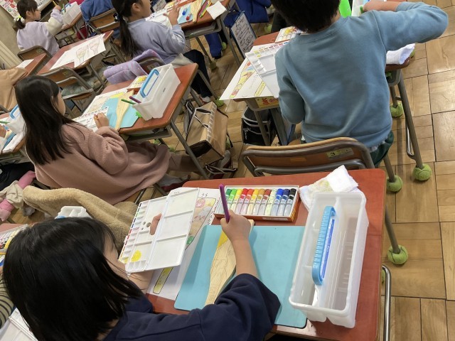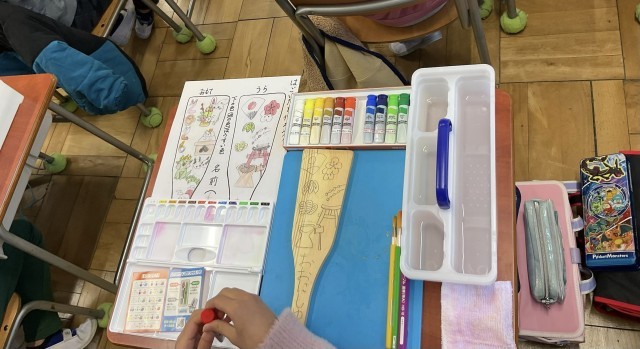 2年生の図工の時間に、羽子板へ絵を描きます。