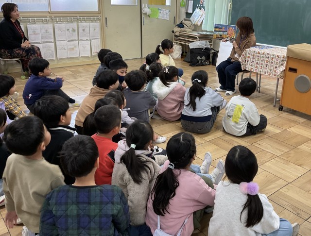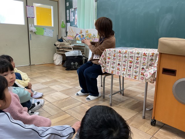 ストーリーテリングや、手遊び、絵本の読み聞かせを、全学年に行なってくれています。