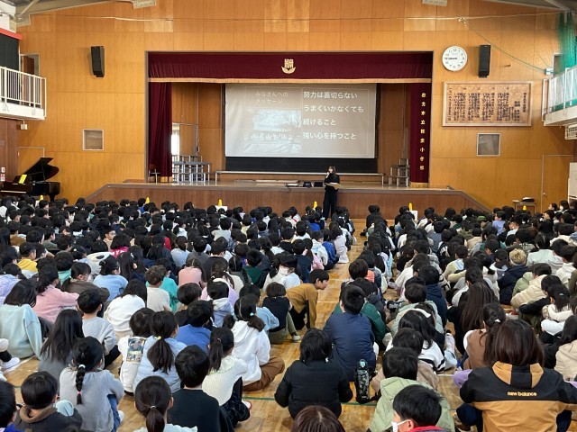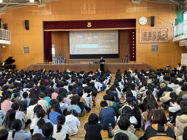 校歌斉唱のあと、校長先生から、冬季オリンピックでのアスリート「平野歩夢」さんの姿から、