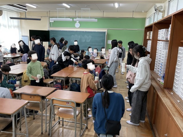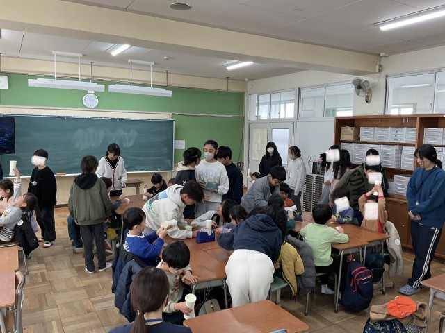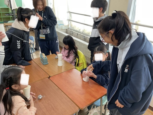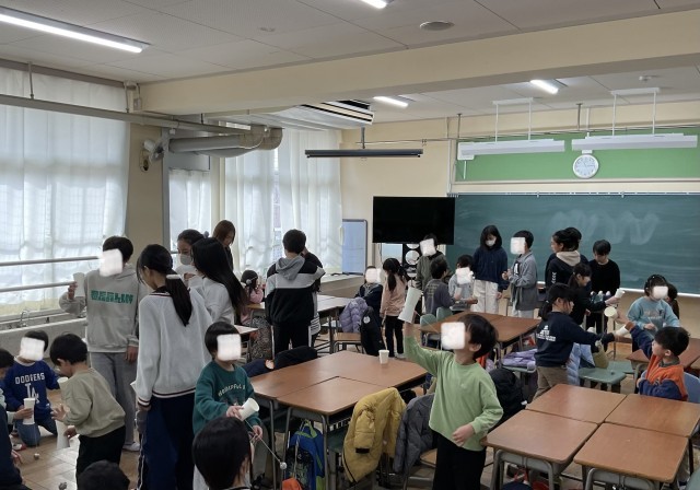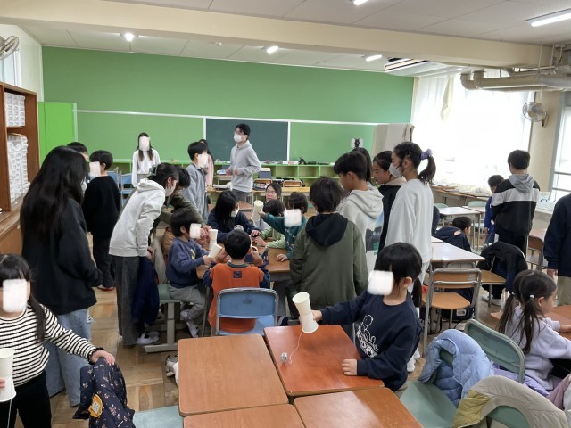 授業体験では、5年生が、紙コップのけん玉づくりを一緒に行い、一緒に遊びました。