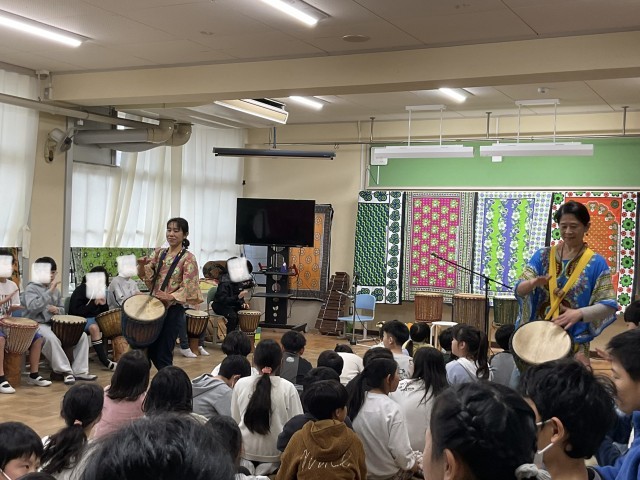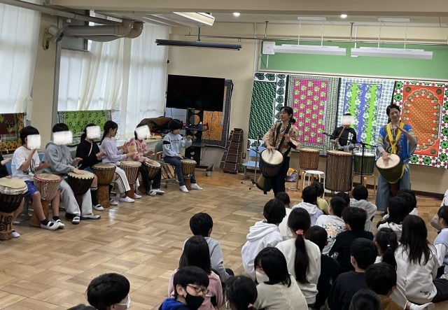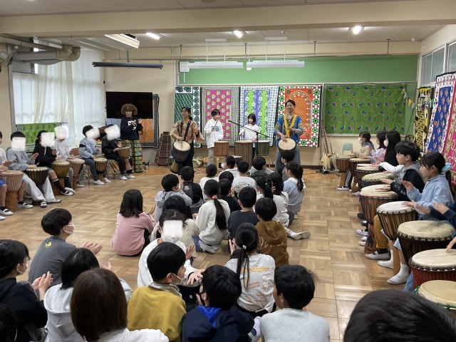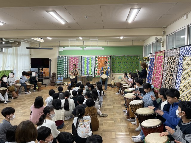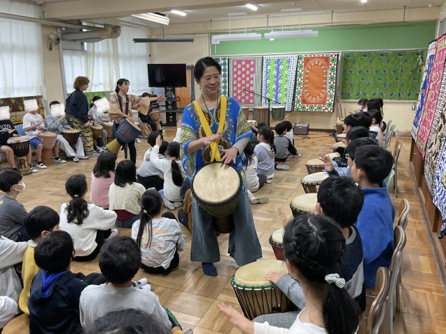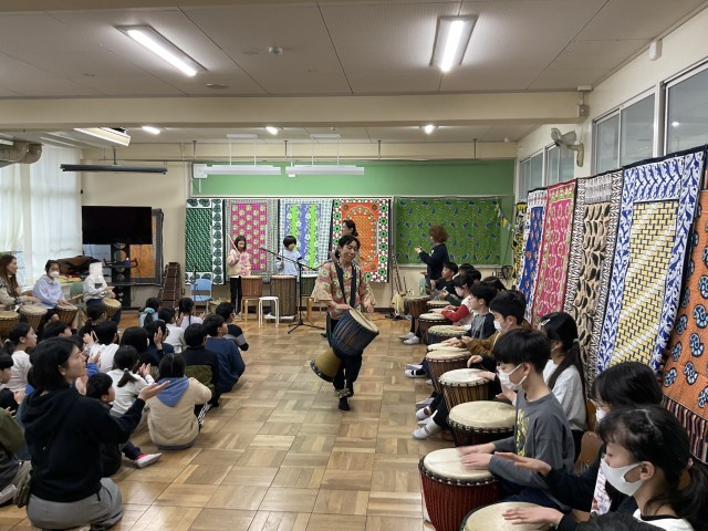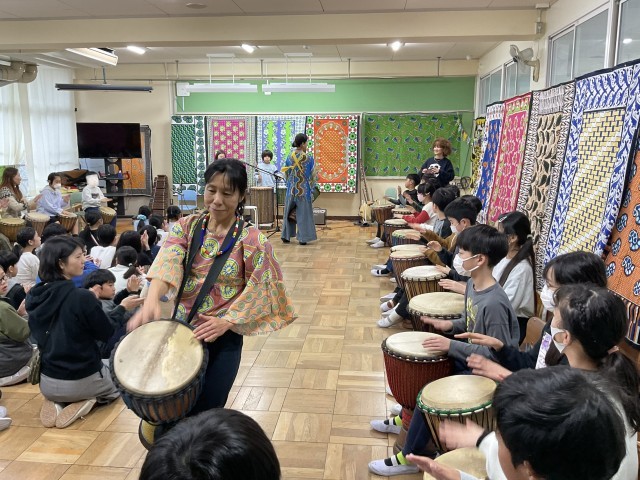 ジェンベは、演奏を聞くだけでなく、実際に自分たちで、触って、叩いて、一緒にリズムを楽しみます。