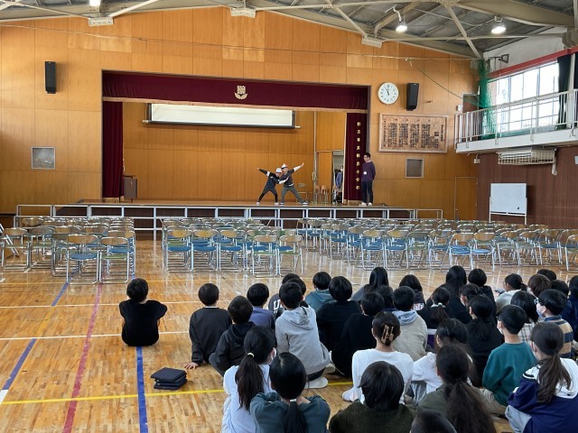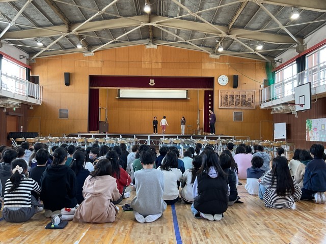 体育館では、入学式に向けて、学校生活の様子を伝えるために劇の練習をしています。