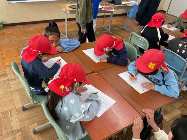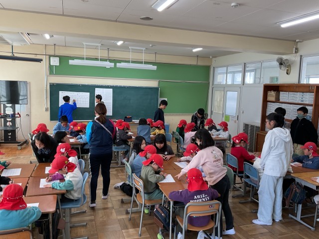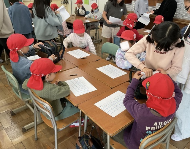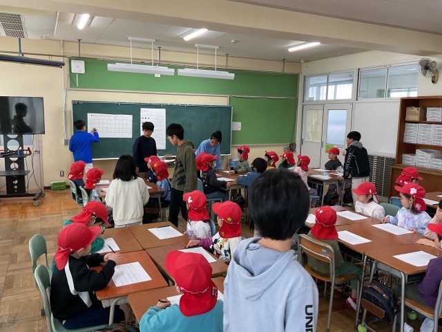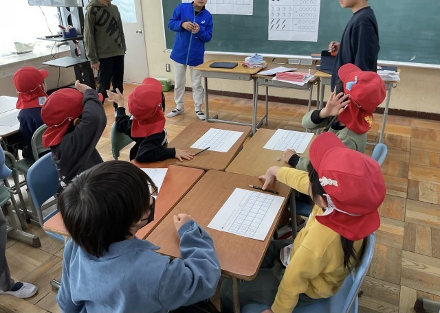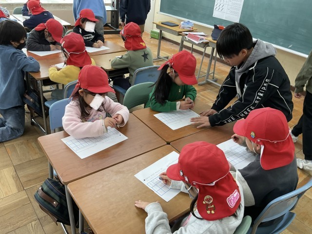 多目的室では、授業担当の5年生が、数字の練習などのプリントを使って、5歳児さんに