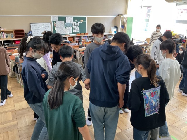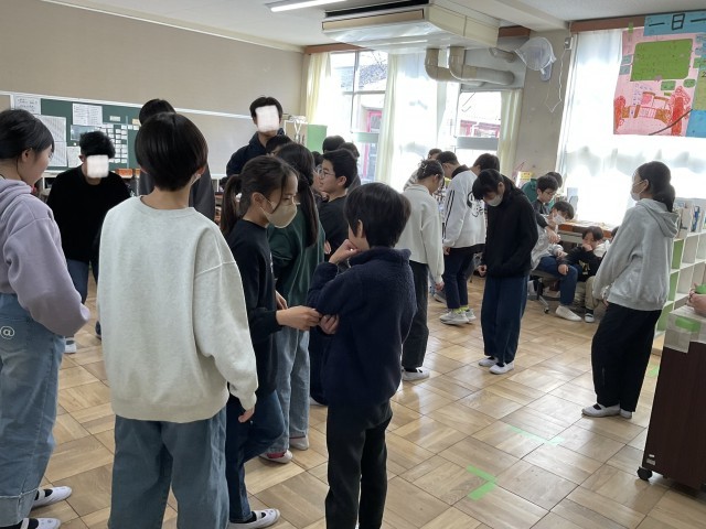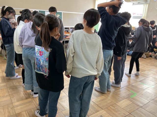 6年生のこのクラスでは、教室の床のマス目を使った遊びをみんなで楽しんでいました.