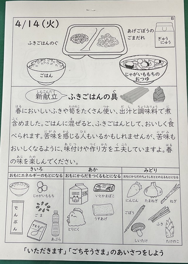 ふきごはんの具は新しい献立で、ふきや筍を使った春らしいメニューでした。