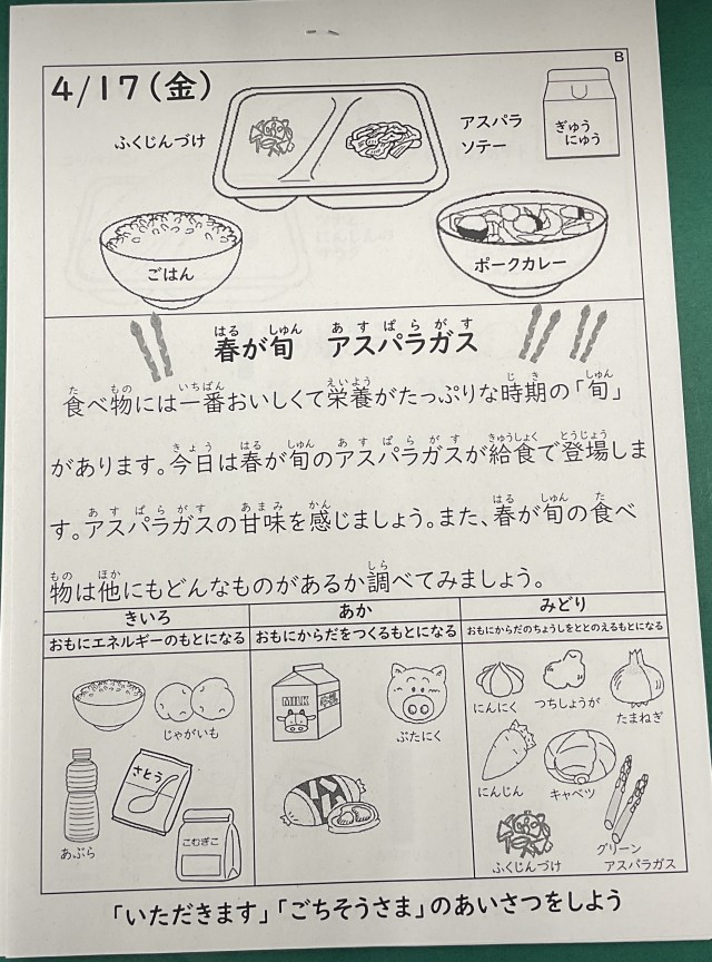 アスパラガスは苦手な児童もいるかもしれませんが、苦味が少なく、食べやすくてとてもおいしくいただきました。