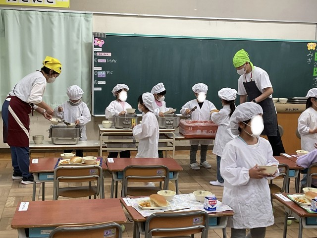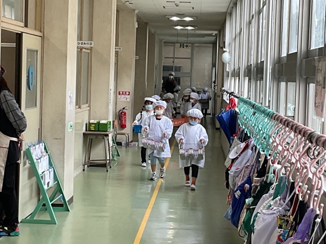 配膳室から協力して運んだ給食を、当番さんが配膳していきます。