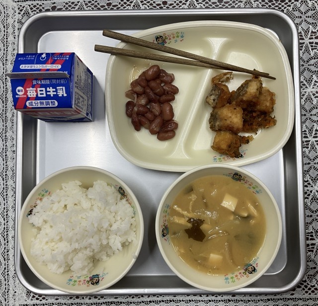 甘い金時豆と香ばしいホキの南蛮漬けで、ごはんがよく進む組み合わせです。