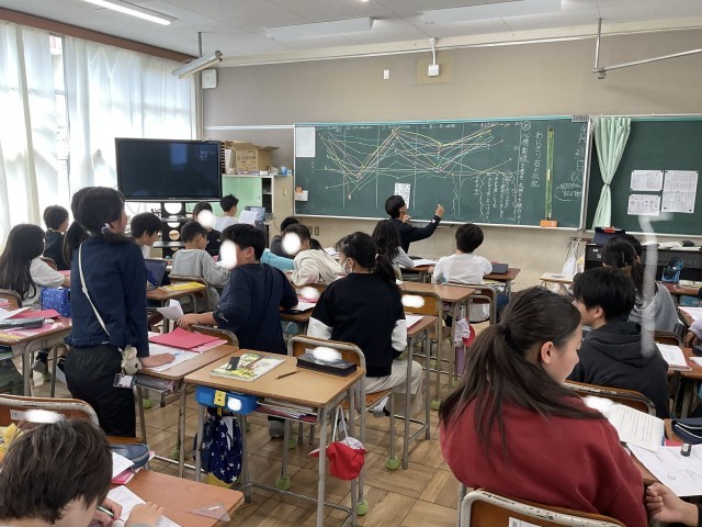 まずは、自分で心情曲線を書き、友だちと共有、その後、黒板に自分の心情曲線を書きに行き、気持ちについて全体で共有していました。