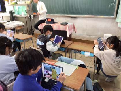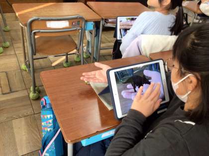 「うわっ、大きい!」「すごい!」などと歓声をあげ、画面上に現れたピカチューやぞう、車などを動かして、仮想空間で手の上にのせてみます.