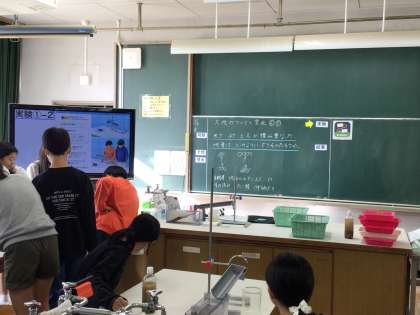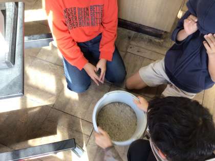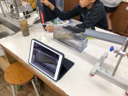 バケツの砂を揺らし地震や、水槽に川底の土砂の様子を