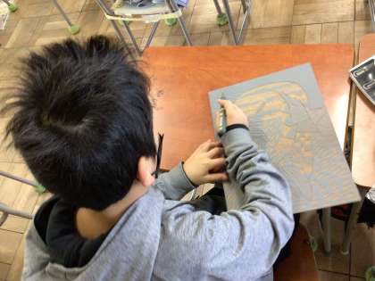 いつも元気な5年生ですが、真剣に彫刻刀を使って