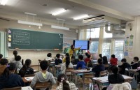 先生が、紙コップに糸のついた「糸電話」を用意しています。