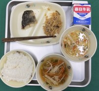 2月20日(金)の給食です。メニューは・牛乳・ご飯・けんちん汁・じゃこ豆・鯖の塩...