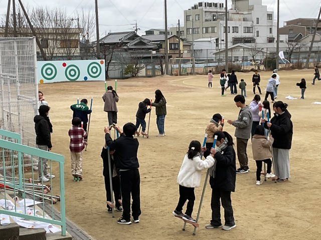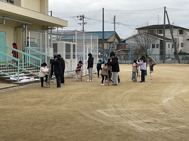1・6年生交流 2 公開日 2026/01/26 更新日 2026/01/26 津田小っ子の今をお知らせします タコあげは一斉にやると糸が絡まったりするので、半分ずつ交代で取り組み、待っている子たちは竹馬をしていました。1年生が乗れるように、6年生が竹馬を持ってあげていました。優しいお兄さん・お姉さんたちに手伝ってもらって、1年生も安心だったと思います。 いいね(0)
