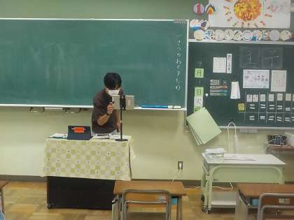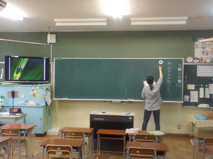 担任の先生は、画面の子どもたちに声をかけたり、黒板に板書をしたりしています。
