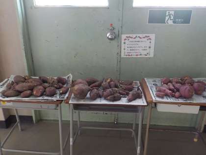2年生の教室前のろうかに、今日ほったさつまいもが、展示されていました。