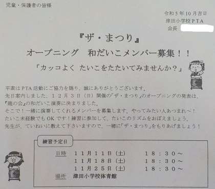 オープニングで和太鼓をたたきたい人を募集(ぼしゅう)しているお便りが、子どもたちに届いています。