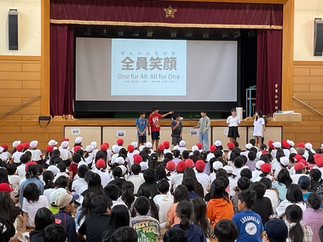 ・代表委員会の代表の子どもたちが、10月25日(土)に開催する「運動会のスローガン」をお知らせしています。『全員笑顔 One for All All for One.(一人は皆んなのために 皆んなは一人のために)』運動会の大成功に向けて、スローガンを大切にし、皆んなで力を合わせて取り組みましょう。
