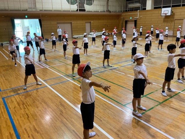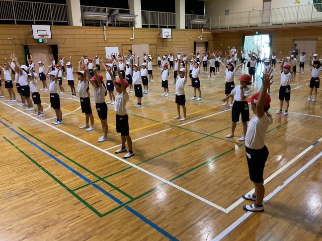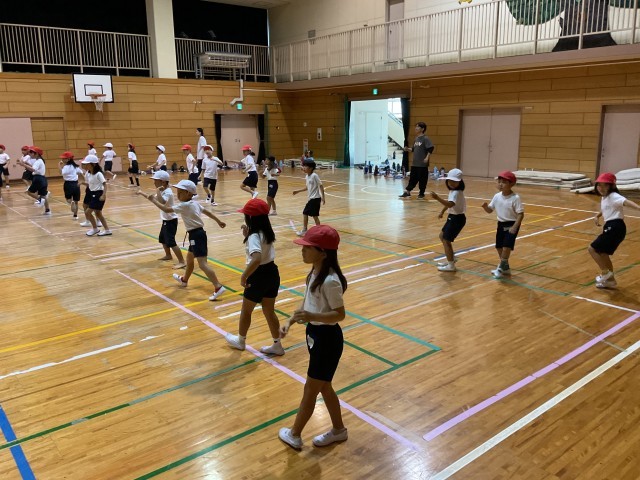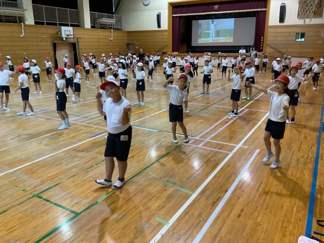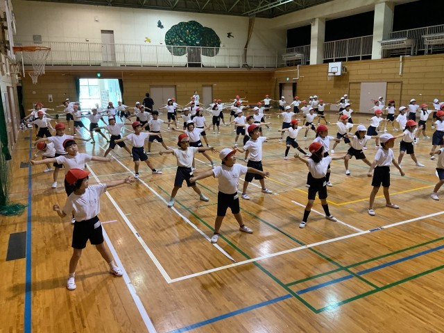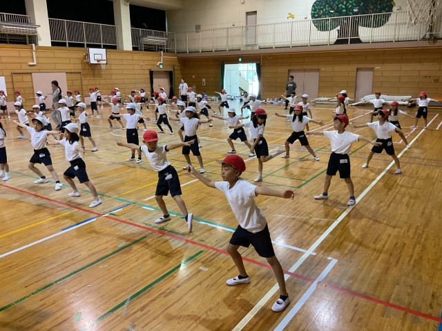 2年生合同の体育では、運動会に向けた団体演技のダンス練習が行われています。前方のスクリーンには先生の踊る動画が映し出され、子どもたちはその動きを真剣に見つめながら、音楽に合わせて一生懸命に体を動かしています。腕を大きく伸ばしたり、ステップをそろえたりと、細かな動きにも気を配りながら、リズムよく踊っています。笑顔いっぱいでとても楽しそうに踊っています。