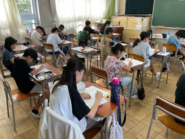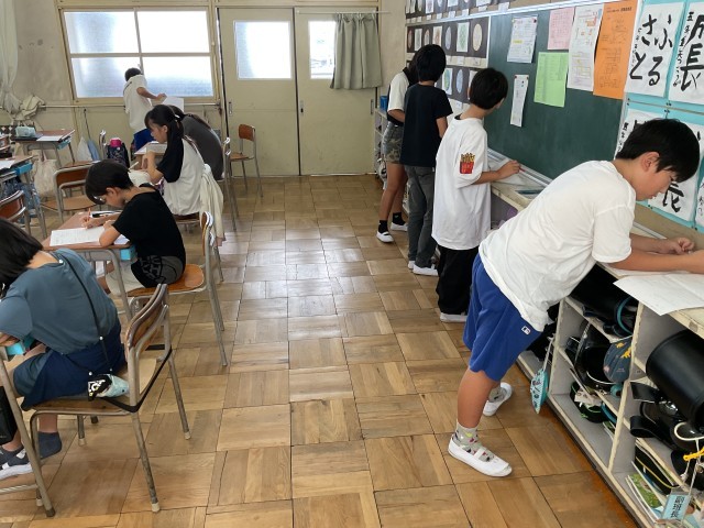 5年生の算数の授業では、「分数・小数・整数の関係」について学習しています。子どもたちは、プリントを使って計算問題や文章問題など、色々な問題に意欲的に取り組み、理解を深めています。問題を解いた後は、答え合わせを通して自分の理解を確認し、さらにプレチェックテストを受けて定着を図っています。