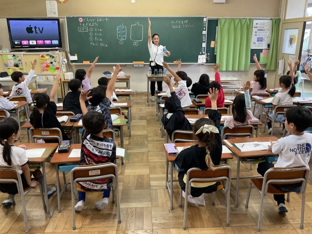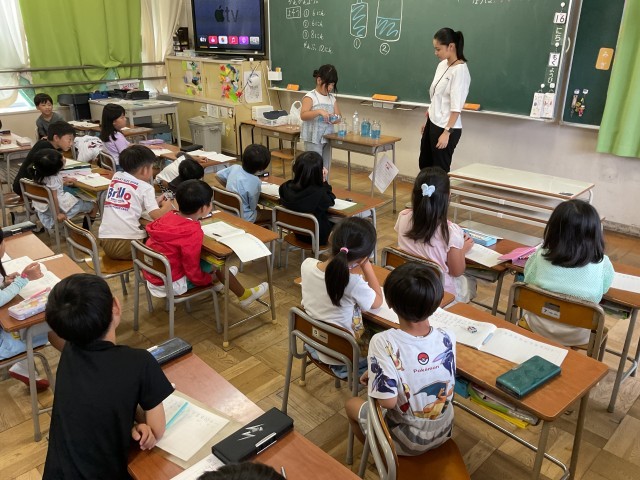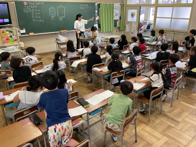1年生の算数の授業では、「どちらが多いか考えよう」をめあてに、水の量の比べ方について学習しています。3種類のペットボトルに入った色を付けた水を、同じ形のコップに移し替えることで、見た目で量の違いを確認しています。児童たちは、先生の問いかけにしっかりと考えて答え、積極的に手を挙げて発言しています。実際に水を移す活動を通して、比べるときには同じ容器を使うことが大切であることを理解し、楽しみながら学びを深めています。