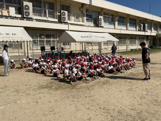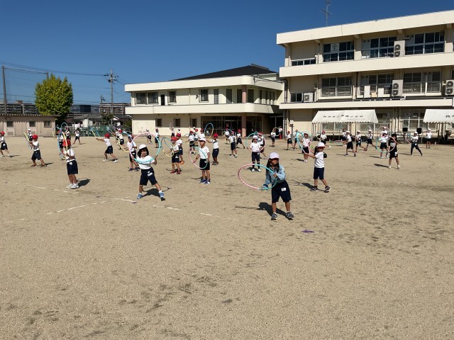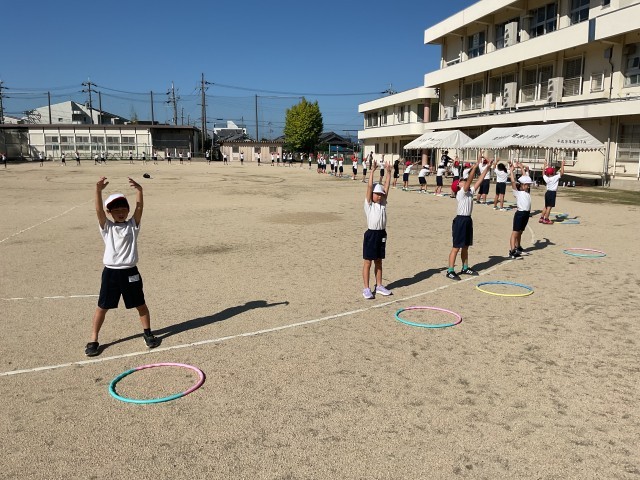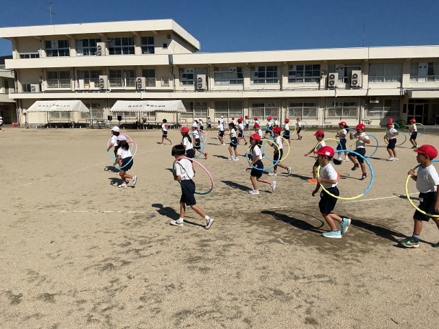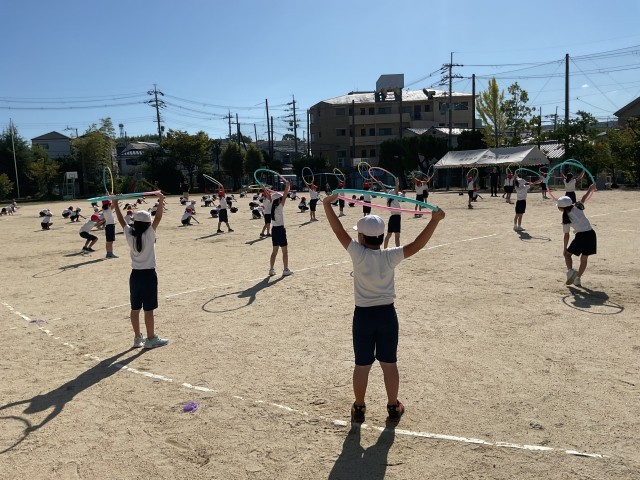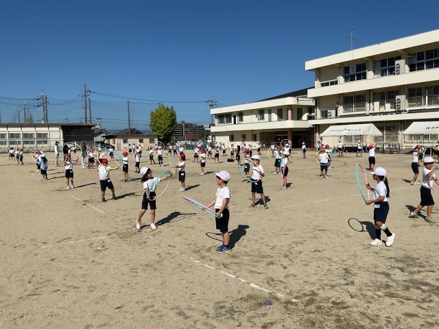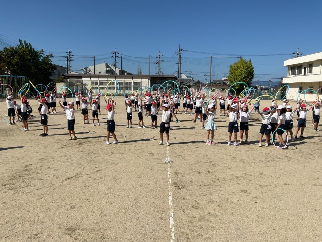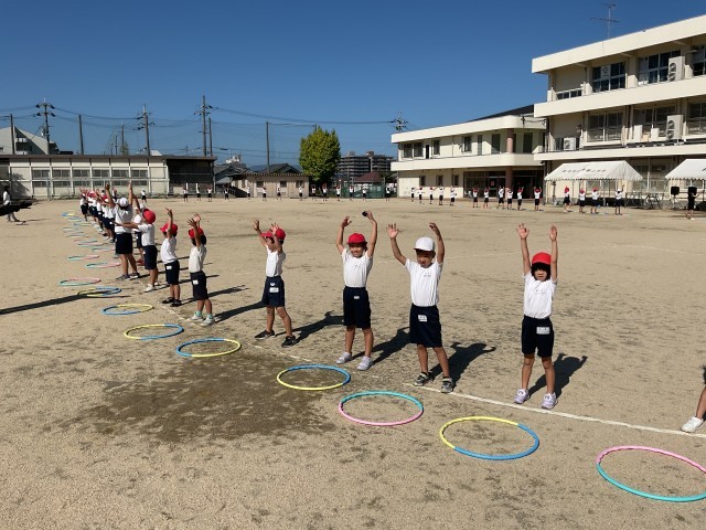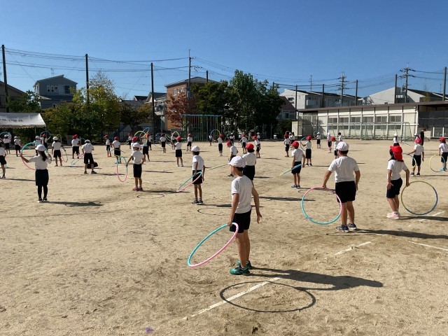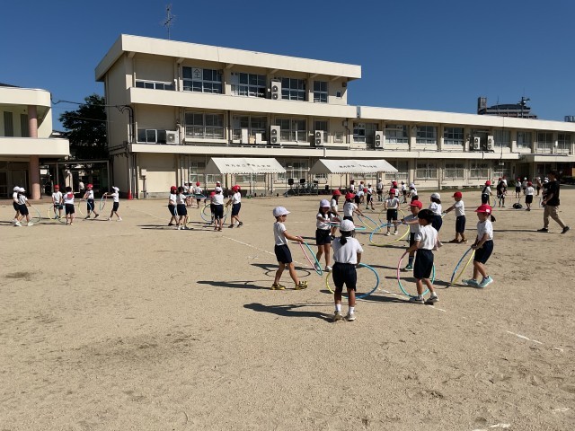 2年生は運動会に向けて、団体演技の練習に取り組んでいます。入場前の所定の位置から運動場いっぱいに広がり、縦横の列をそろえて演技を行う場面や、中央へ移動してからの演技など、フラフープを上手に扱い、一つひとつの動きを先生と確認しながら進めています。先生たちから励ましの声かけもあり、子どもたちは真剣な表情で前向きに懸命に取り組んでいます。