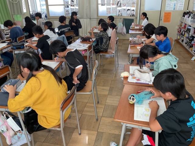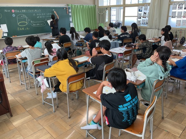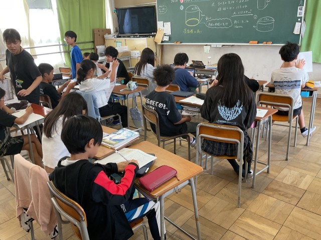 6年生の算数の授業では、「円柱の体積の求め方を考えよう」をめあてに学習を進めています。子どもたちは、体積の求め方「底面積×高さ」や、「底面積=半径×半径×3.14」の公式を確認しながら、円柱の体積を求める問題に取り組んでいます。いくつかの例題を解く中で、公式の使い方や計算の工夫を理解し、考えを深めています。その後、計算ドリルやタブレット教材「Navima」を使って、これまでに学習した立方体や直方体の体積の復習にも取り組み、理解の定着を図っています。