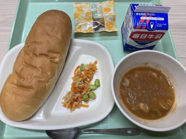 今日の給食の献立は、「ハッシュドポーク・ササミと人参のサラダ・さつまいもチップス・コッペパン・牛乳」です。ハッシュドポークは、コクと旨みのあるソースが豚肉や玉ねぎなどに染み込み、パンにもよく合います。ササミと人参のサラダは、さっぱりとした味付けで、シャキシャキ食感が楽しい一品で、これをコッペパンに挟んで食べました。今日も美味しくいただきました。