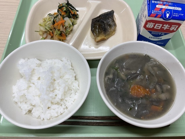 今日の給食の献立は、「ごんぼ汁・焼き魚(ほっけ)・煮浸し・ご飯・牛乳」です。ごんぼ汁は、ごぼうの風味をはじめ、いろいろな具材をしっかり感じられ、楽しめる一杯です。焼き魚はほっけの旨みが引き立ち、皮は香ばしく、身はふっくらしていて、煮浸しは、野菜にだしがよく染みていて、やさしい味わいが口の中に広がり、今日も美味しくいただきました。