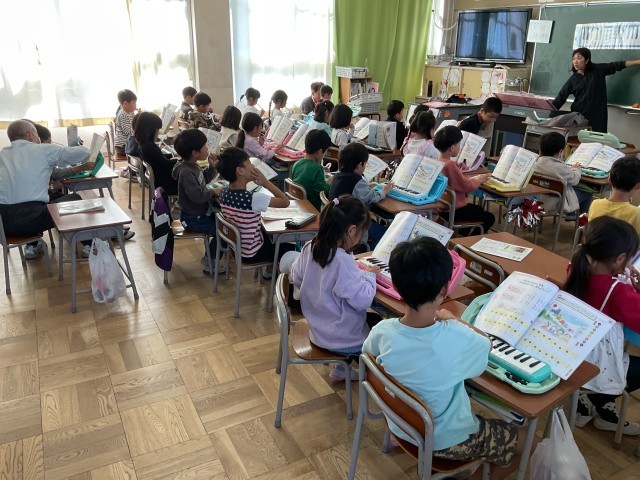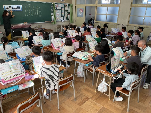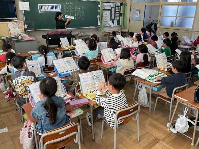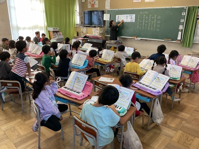 1年生の音楽の授業では、『ひのまる』の曲を鍵盤ハーモニカで演奏する練習に取り組んでいます。子どもたちは、先生の指示に従い、音の高さに気を付けながら、鍵盤の位置を覚えて一音一音丁寧に吹こうと努めています。「ド、ド、ソ、ソ、ラ、ラ、ソ」といった音階をしっかりと吹き、リズムに乗って皆んなと音を合わせ、教室内に響く鍵盤ハーモニカの演奏音を楽しみながら取り組んでいます。