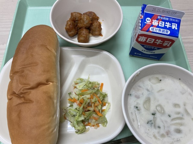今日の給食の献立は、「インゲン豆のクリームスープ・肉ボール・ラハノサラタ・コッペパン・牛乳」です。豆のやさしい甘みとまろやかな口当たりのクリームスープ。ソースの旨みがしっかり感じられる肉ボール。キャベツのシャキシャキ感とほどよい味付けのラハノサラタをコッペパンに挟み、食べやすさがアップ。今日も美味しくいただきました。