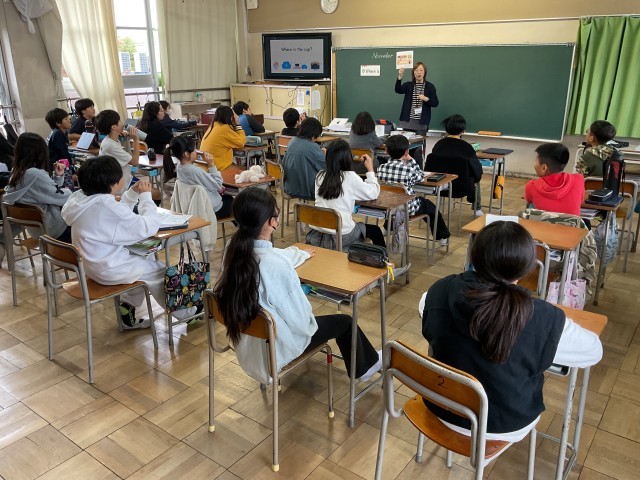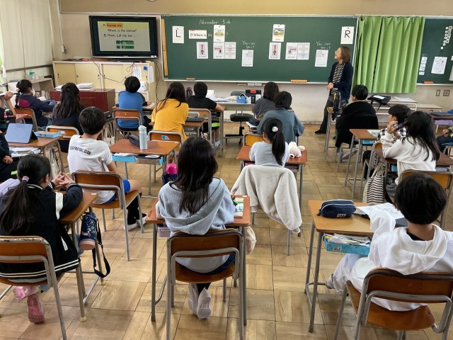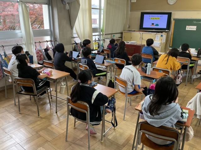 5年生の英語の授業では、以前学習した「物がどこにあるか」を尋ねる表現やその答え方を復習した後、「街の中にある建物(施設)の場所を尋ねる言い方・答え方」を学んでいます。