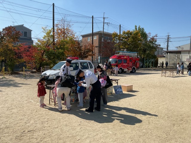 今年度の『菅原祭』は、「おしごとマルシェ」とのコラボレーション企画として開催されました。運動場にはパトカーや消防車が来校し、子どもたちは間近で見たりなど、貴重な体験をしていました。さらに、管理棟2階では、さまざまな職業に関する体験ブースが設けられ、子どもたちは興味を抱き参加していました。